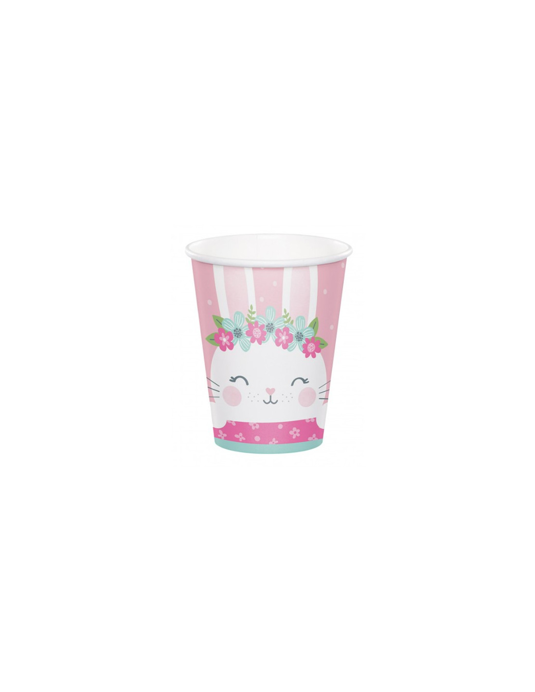 Sono rosa con dei pois bianchi ed un coniglietto sorridente con una corona di fiori.